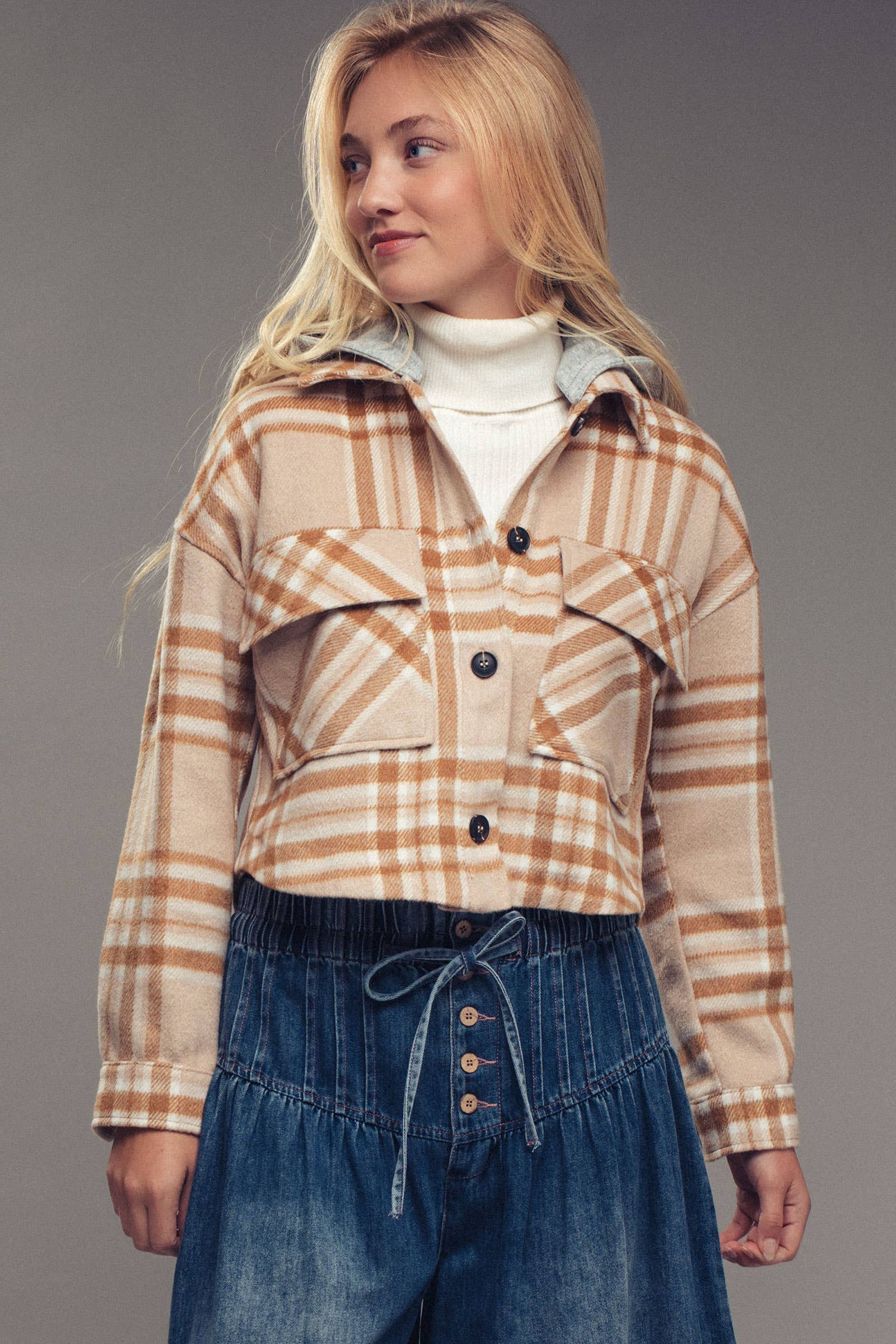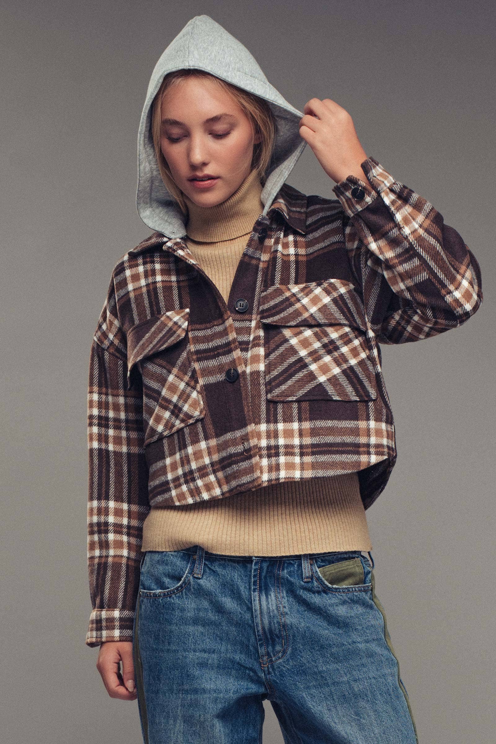 Embrace effortlessly cool autumn vibes with this versatile brushed plaid jacket, featuring a modern cropped cut and a detachable hoodie for endless styling options. Its relaxed fit and rugged details make it perfect for layering over your favorite graphic tee for weekend adventures or dressing up with a chic skirt. Achieve that perfect blend of comfort and edgy style, easily taking you from weekday to weekend.